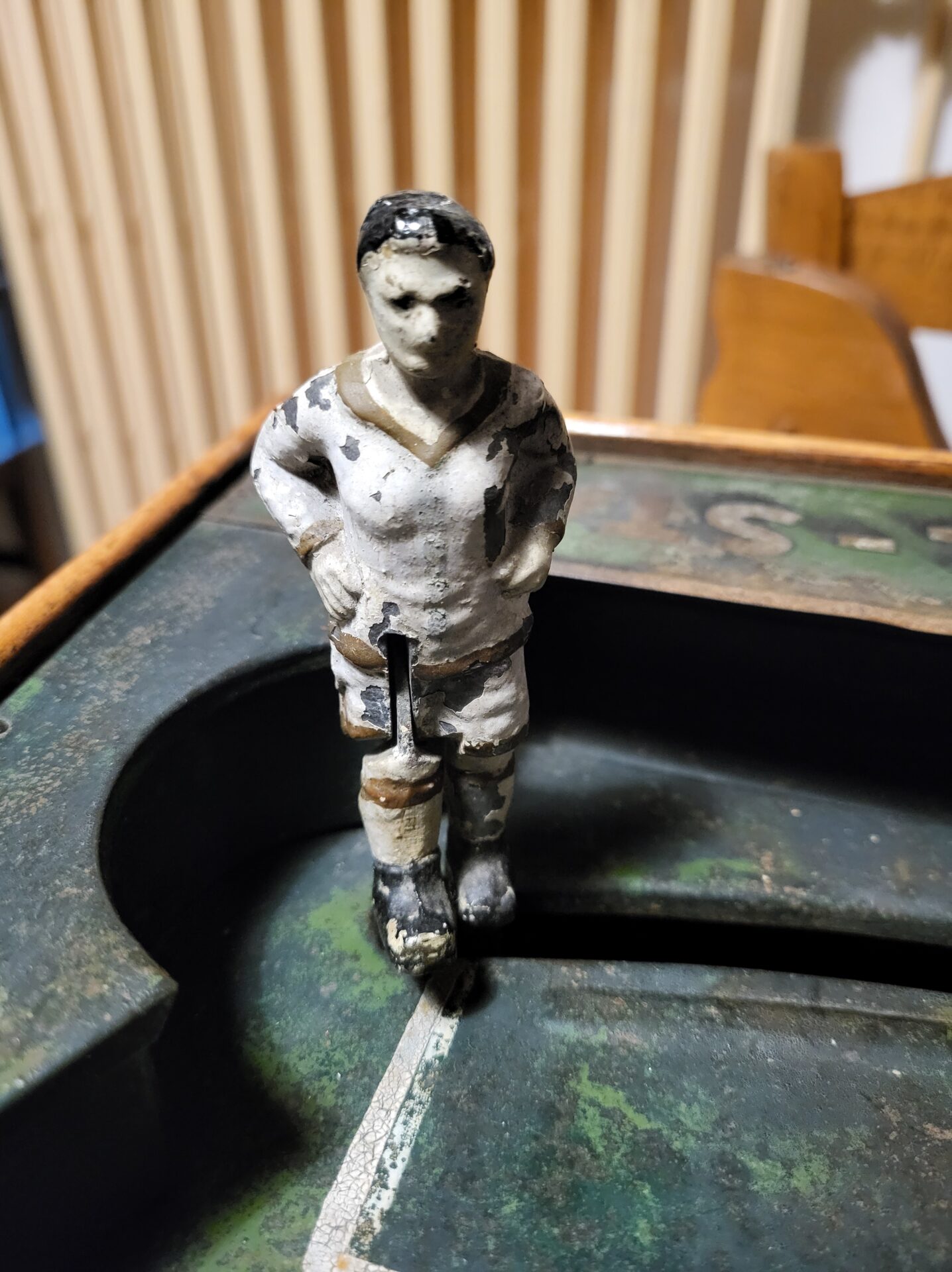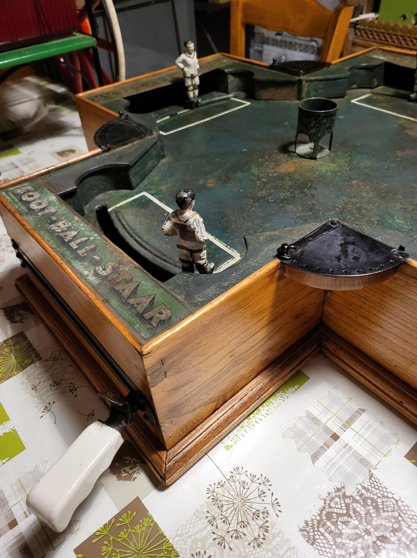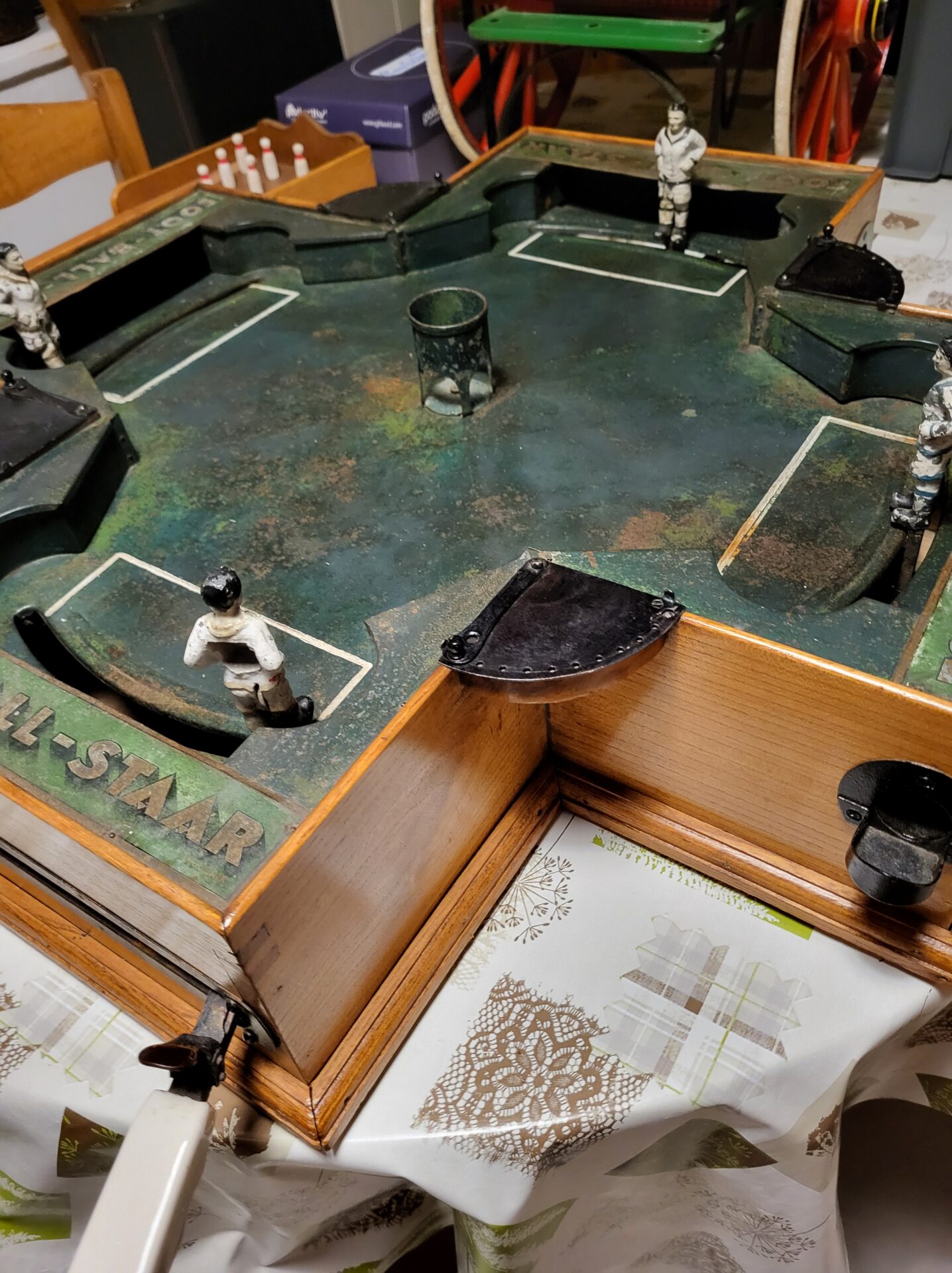 Il s’agit d’un jeu de table inspiré du football, avec des éléments mécaniques pour jouer à deux ou quatre joueurs, un peu comme une version ancienne du baby-foot. Ce jeu a connu un certain succès commercial en Belgique et à l’étranger à l’époque, notamment dans les lieux publics comme les cafés ou salles de loisirs. (cf. Nicolas Beurrier)